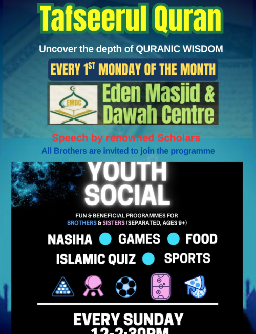 We offer a wide range of courses for children including evening and weekend classes, and occasional courses, please contact our Iman Sheikh Muhammad Sadi or email: enquiries@edenmasjid.org.uk and Click here to get Eden Academy Admission Form –